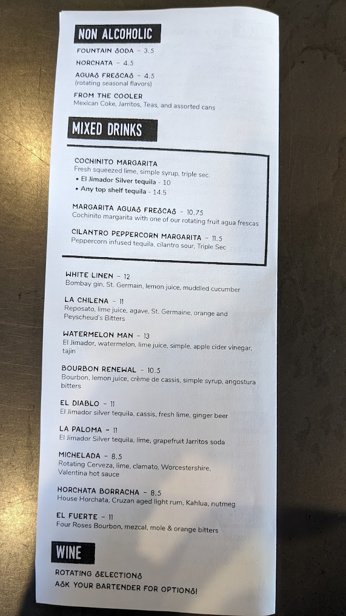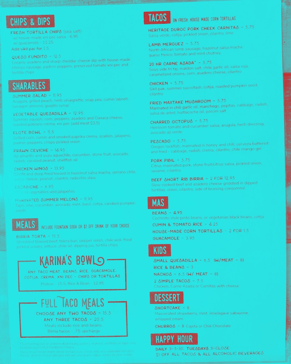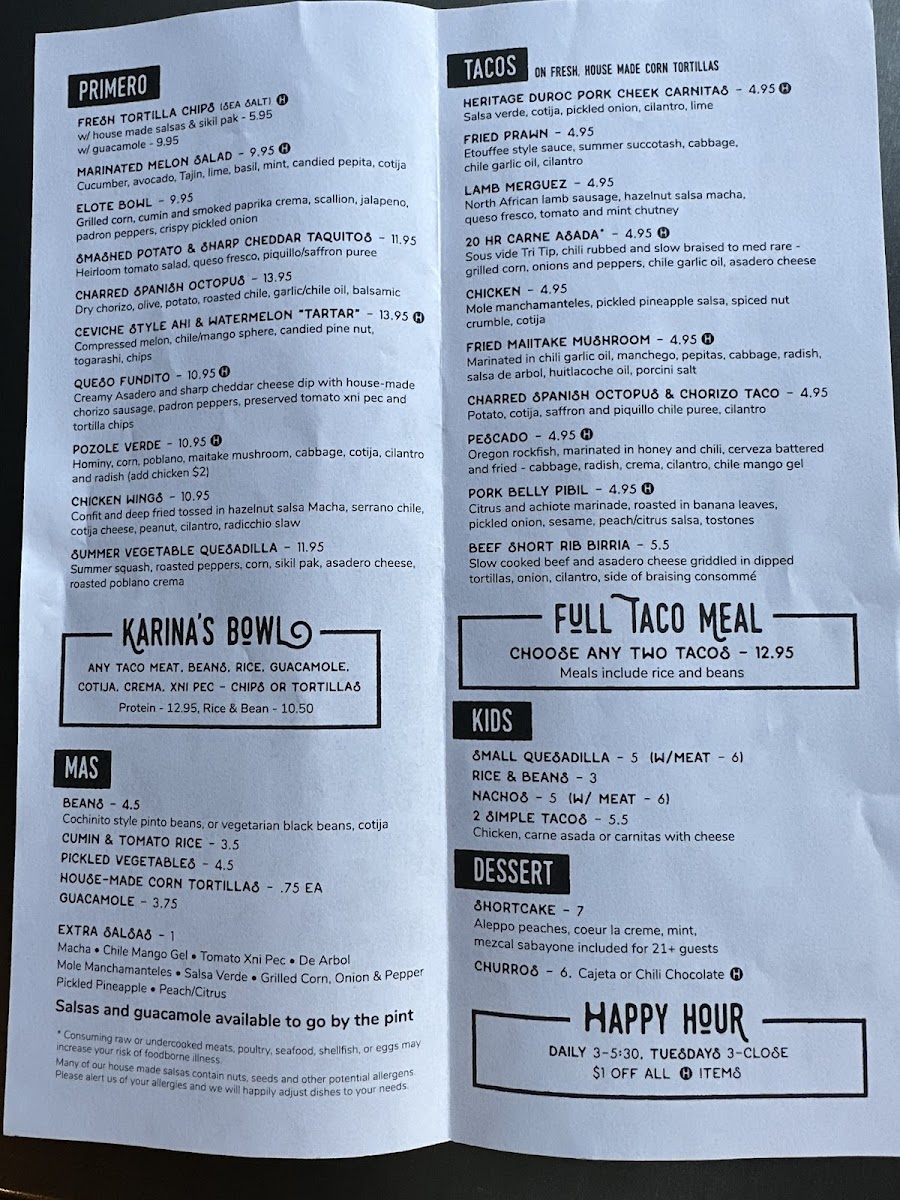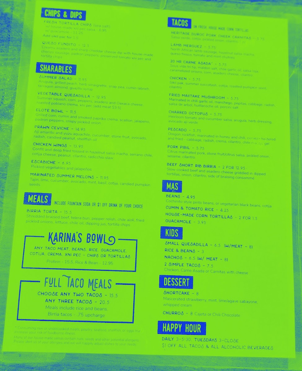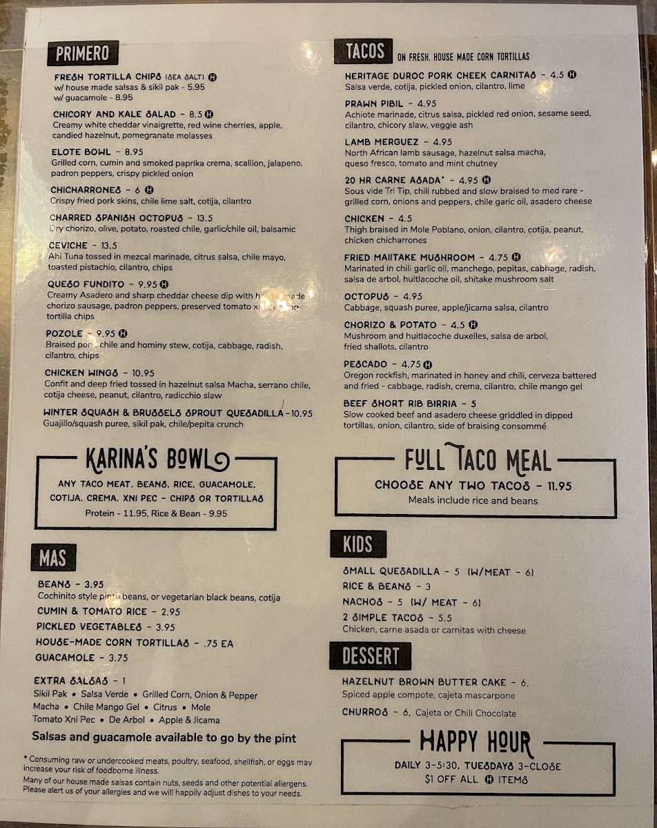 Macha, Chile Mango Gel, Tomato Xni Pec, De Arbol, Mole Chichillo, Salsa Verde, Grilled Corn, Onion & Pepper Sikil Pak. Consuming raw or undercooked meats, poultry, seafood, shellfish, or eggs may increase your risk of food borne illness. Many of our house made salsas contain nuts, seeds and other potential allergens. Please alert us of your allergies and we will happily adjust dishes to your needs.